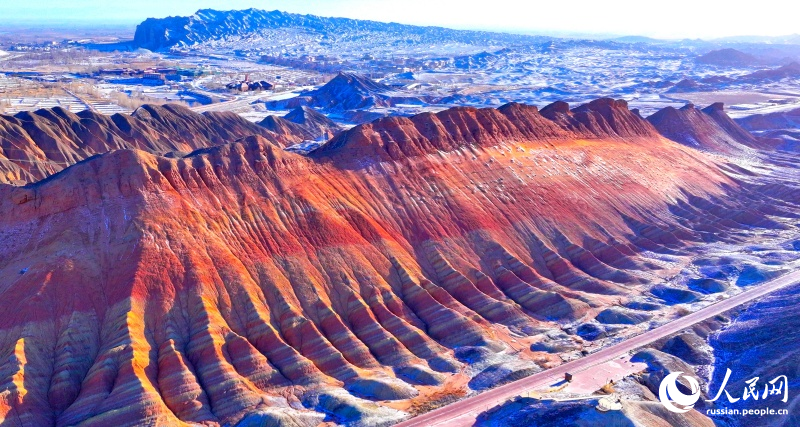 Красочные скалы в геопарке Чжанъе Данься в провинции Ганьсу покрыты снегом
