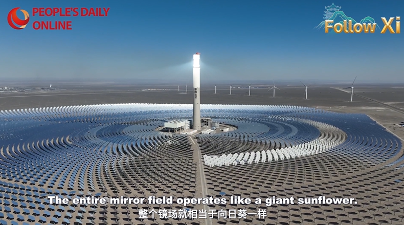 26 августа, ?Жэньминь жибао? онлайн -- Фототермическая башенная электростанция мощностью 50 МВт в Хами Синьцзян-Уйгурского автономного района работает на расплавах соли. Более 14,5 тысяч пятиугольных гелиостатов, расположенных концентрическими кругами вокруг центральной башни, напоминают бескрайнее море подсолнухов, вращающихся вместе с солнцем, чтобы собрать свет и тепло.