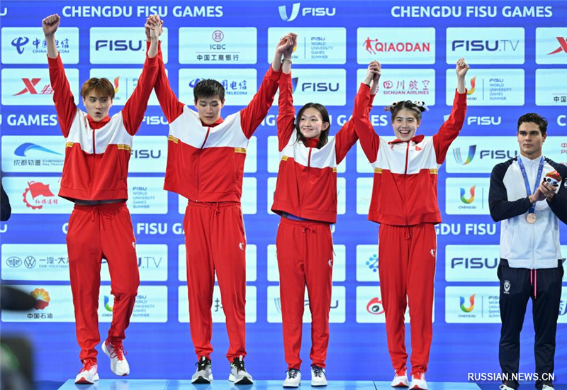 Китайская команда завоевала золото в финале смешанной эстафеты 4х100 м вольным стилем среди мужчин и женщин на соревнованиях по плаванию в рамках Универсиады в Чэнду