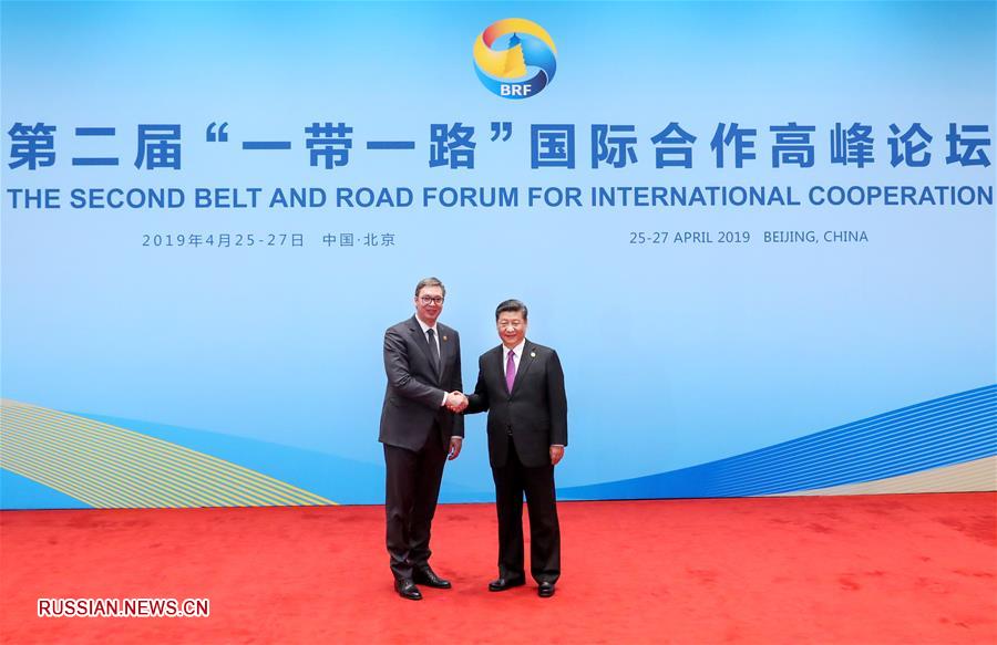 Пекин, 27 апреля /Синьхуа/ -- Председатель КНР Си Цзиньпин сегодня приветствовал лидеров и руководителей международных организаций, которые принимали участие в заседании круглого стола 2-го Форума высокого уровня по международному сотрудничеству в рамках "Пояса и пути". На фото -- Си Цзиньпин и президент Сербии Александр Вучич.