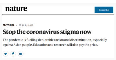 10 апреля, ?Жэньминь жибао? онлайн -- Один из ведущих научных журналов мира Nature в редакционной статье, опубликованной 7 апреля, принес свои извинения за прошлые информационные материалы, в которых связывал новый тип коронавируса с Уханем и Китаем. Журнал также призывает отказываться от стигматизации болезни, которая разжигает расизм и дискриминацию против азиатов, подрывая их желание учиться и работать в иностранных университетах, институтах и других научных учреждениях.