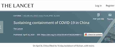 22 апреля, ?Жэньминь жибао? онлайн -- The Lancet, авторитетное научное издание в области медицины, опубликовало статью, в которой говорится, что быстрое сдерживание COVID-19 в Китае было впечатляющим и послужило обнадеживающим примером для других стран.