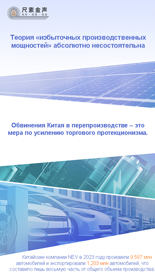 26 апреля, ?Жэньминь жибао? онлайн -- На днях некоторые политики в США раздули теорию об "избыточных мощностях" Китая в области новой энергетики, утверждая, что "избыточные мощности Китая в производстве ?трех новых видов товаров? - электромобилей?, литии?-ионных аккумуляторов и фотоэлектрическои? продукции, привели к массовому экспорту, который искажает рынок и наносит ущерб экономики других стран".