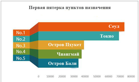 В первой половине этого года популярными направлениями были Япония и Республика Корея, Сеул и Токио заняли первое и второе места соответственно. Ключевыми словами стали кулинария, косметика и звезды. Остров Пхукет и город Чиангмай разместились на третьей и четвертой строчках, индонезийский остров Бали – на пятом месте. Популярными метками стали ?пляж?, ?морские продукты? и ?дайвинг?, путешествие по морским островам – это также одно из важных направлений зарубежного туризма.