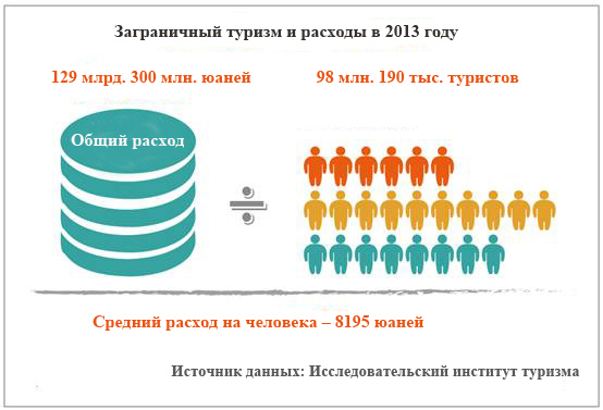 В 2013 году всего 98 млн. 190 тыс. китайцев совершили зарубежные поездки, общий расход достиг 129 млрд. 300 млн. юаней, в среднем на человека составляет 8195 юаней.