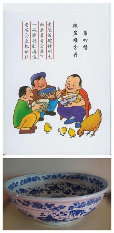 Во время еды жители Шэньси пользуются белыми с синими цветами мисками, производимыми в Яочжоу, известными в народе как ?лаовань? (?старая миска?). По размерам такая миска даже больше маленького тазика, из-за чего возникла поговорка – ?Старую миску не отличить от тазика?.