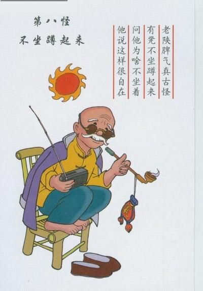 Мужчины в районе Гуаньчжун провинции Шэньси три раза в день проводят "собрание с чашками" на корточках. Если садятся, то на более чем один час. Зимой они любят греться на солнце, сидя на корточках спиной к лучам, или играть в шахматы. Таким образом, у жителей района Гуаньчжун появилась привычка "сидеть на корточках". Жители других провинций удивляются и спрашивают шэньсийцев, почему они не садятся на скамью?! На самом деле, сидеть на корточках - это привычка, люди так отдыхают от усталости.-о-