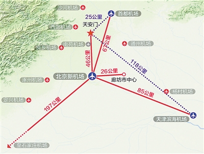 Новый аэропорт разместится между поселками Юйфа, Лисянь района Дасин Пекина и городом Ланфан провинции Хэбэй, станет крупным международным авиаузлом. Планируется строительство семи взлетно-посадочных полос, годовой пассажиропоток может достигать 100 млн. человек.