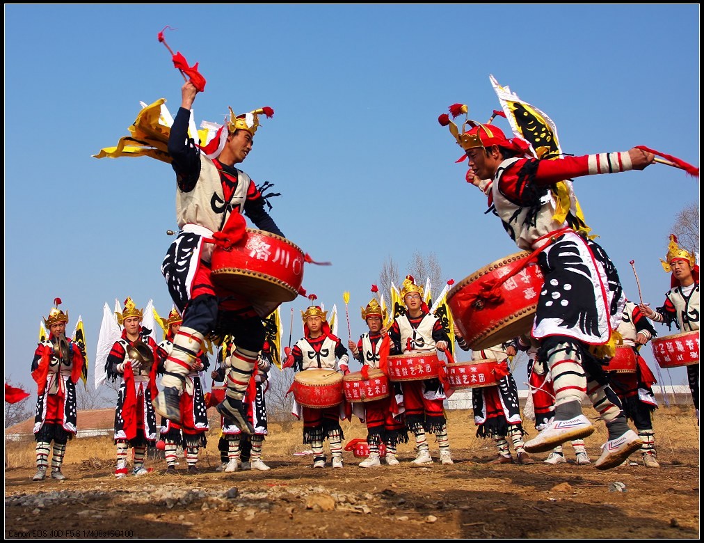 Игра на барабанчиках будто воспроизводить силу и дух древних войн, исполнители, главным образом, мужчины. Во время выступления на спинах у них боевые знамена, они надевают нижнюю часть кирасы, а ноги обвязывают, артисты либо подвешивают к поясу барабан, либо держат в руках. Выступление будто воспроизводит древний театр военных действий.