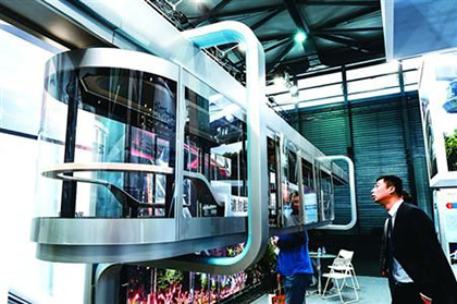 8 апреля, ?Жэньминь жибао? онлайн -- Совсем скоро в Шанхае появится "воздушный поезд"? На открывшейся накануне в Шанхае выставке Rail+Metro China-2015 особое внимание привлекла модель воздушного поезда, выполненного из прозрачного стекла. Вагоны похожи на две "стеклянные коробки", в передней части расположена "барная стойка" для того, чтобы любоваться городскими видами. В поезде уже высвечиваются названия станций района Цзинъань.