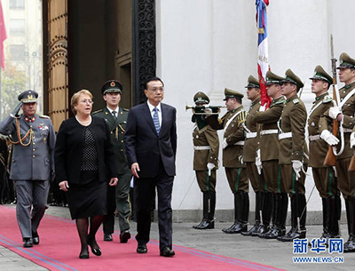 25 мая президент Чили Мишель Бачелет приветствовала премьера Госсовета КНР Ли Кэцяна на государственном банкете в президентском дворце, внезапно произошел сбой во время исполнения государственного гимна, и музыка остановилась. Премьер подхватил и исполнил гимн сам, к тому же стал солистом для китайской делегации. В последовавшей речи Бачелет поблагодарила Ли Кэцяна за мудрость и юмор, проявленные им в решении этой ?проблемы?. На что Ли Кэцян ответил, что музыка не имеет границ, и мы все можем понять друг друга с помощью песен.-о-