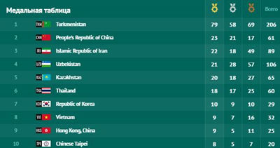 В Ашхабаде продолжаются V Азиатские игры в закрытых помещениях и по боевым искусствам, где сборная Туркменистана уверенно лидирует в общемедальном зачёте, имея в своём активе на данный момент в общей сложности 206 наград, из которых 79 - золотые, 58 - серебряные и 69 - бронзовые. Втором месте сборная Китайской Народной Республики с 61 медалями, из них 23 - золотые, 21 - серебряные и 17 - бронзовые. На третьем идет сборная Ирана с 89 медалями, из них 22 - золотые, 18 - серебряные и 49 - бронзовые.