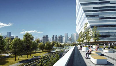 Восточное здание библиотеки расположится в районе Пудун, в 9-этажном здании, общая площадь которого будет 115 тыс. кв. м. Здание примет форму нефрита и будет находиться в городском лесу.