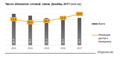 Количество абонентов сотовой связи, имеющих доступ к интернету, при этом стабильно растет третий год подряд - в 2015 на 6%, в 2016 - на 12% и в 2017 - сразу на 15,1% (на конец декабря - 13,9 млн ед). Удельный вес абонентов с выходом в интернет увеличился за год с 47,1% до 52,3% от общего числа абонентов сотовой связи.