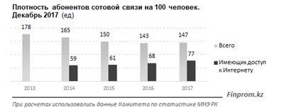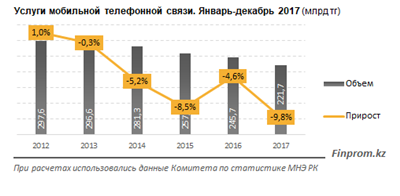 При этом объем услуг операторов мобильной связи уменьшается пятый год подряд. За 2017 год объем услуг мобильной связи составил 221,7 млрд тг, что на 9,8% меньше, чем за 2016 год (245,7 млрд тг).
