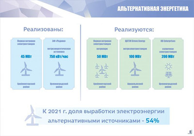 В регионе в данном направлении уже реализован ряд проектов в сфере альтернативной энергетики, такие как ветровая электростанция в Ерейментауском районе (45 МегаВатт) и ветроустановка в Целиноградском (750 Квт/час), которые были представлены на ЭКСПО в Астане.