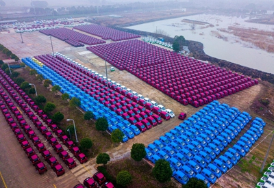 На фото: 19 января 2018 года, на стоянке китайского производителя электрических автомобилей Kandi в уезде Чансин провинции Чжэцзян (Восточный Китай) автомобили общего потребления для выпуска на рынок.