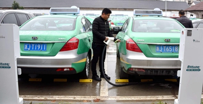 6 января 2018 года, электромобиль во время подзарядки на общей станции быстрой зарядки в уезде Сяньцзю провинции Чжэцзян.