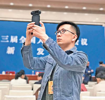 Корреспондент газеты ?Жэньминь жибао? на пресс-конференции в ходе Первой сессии ВСНП 13-го созыва фотографирует с помощью VR-камеры для панорамных съемок.