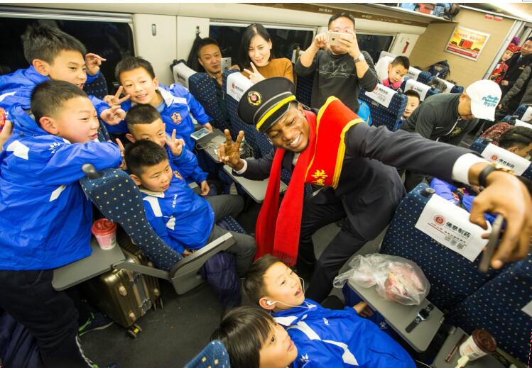 Во время сезона повышенного пассажиропотока ?Чуньюнь? иностранный волонтер фотографируется с китайскими пассажирами в поезде D1925. Фото: ?Жэньминь тупянь?