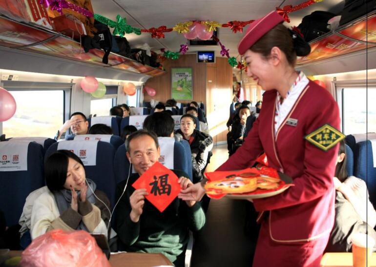 15 февраля 2018 года в поезде G387 Пекин - Далянь начальник поезда поздравляет пассажиров с наступлением китайского Нового года. Фото: ?Жэньминь тупянь? Гао Цзиньсюй