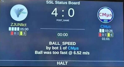 Капитан сборной ZJUNlict Хуан Чжэюань рассказал, что размер игровой зоны составляет 12м*90м, а у каждой команды имеется 8 роботов-футболистов. Матч делится на два равных тайма, каждый из которых длится 5 минут.