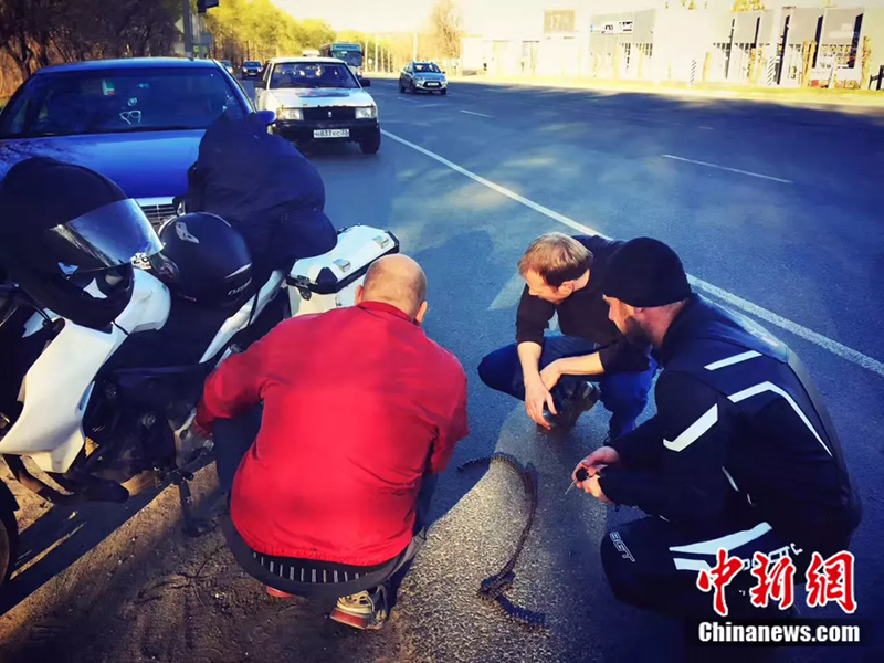 К сожалению, мотоцикл оказался не готов к столь долгому переезду. За 200 км от Москвы, порвалась цепь. Ремонт занял 15-16 часов. Все это время, на холоде, без знания русского языка, Чжэн Цзибинь, махая рукой, пытался привлечь внимание других участников движения. ?На дороге мотоциклистов было мало. Думая, что я приветствую их, люди в ответ махали мне рукой, но не останавливались. К счастью, один из проезжавших мимо мотоциклистов, догадался о том, что мне нужна помощь?.