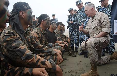 Апрель 2008 года, адмирал корпуса морской пехоты США Джеймс Терри Конвей посещает войска морской пехоты ВМС НОАК.