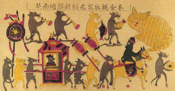 История о том, как ?мышь выдает замуж свою дочь?, известна каждому. В народе распространены разные версии этой истории, кроме этого, это хороший материал для народного искусства, в том числе театра теней, вырезок из бумаги, узорной шелковой ткани и новогодних лубочных картин, осталось немало выдающихся произведений.