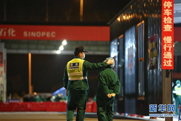 Вечером 10 февраля на контрольно-пропускном пункте карантинного контроля на одной из высокоскоростных автодорожных магистралей города Чжоушань провинции Чжэцзян Ян Чэньхуа (слева) и Фан Мэнся разговаривают во время смены дежурства. С тех пор, как в городе Чжоушань началась борьба с эпидемией, полицейский Ян Чэньхуа погрузился в работу по профилактике и контролю распространения коронавируса, его жена Фан Мэнся – медицинский работник. После вспышки эпидемии супруги могут видеться раз в неделю. Поскольку они работают в разное время, они успевают лишь обменяться парой слов во время смены дежурства.