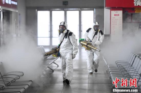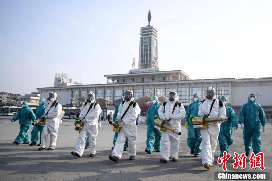 4 февраля, для противодействия эпидемии COVID-19 добровольцы держит тяжелый дезинфекционный аппарат и дезинфицирует помещения на вокзале Чанша и на улице.