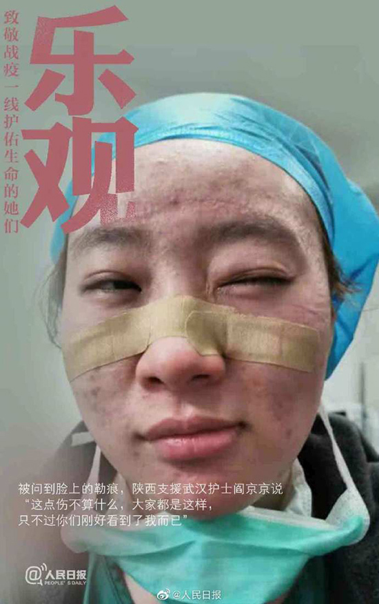 Оптимизм: когда спросили об отечных следах и шрамах от длительного ношения медицинских масок на лице, медсестра Янь Цзинцзин сказала: ?Эта следы ничего не значат, мы все так выглядим, вы просто меня увидели?.