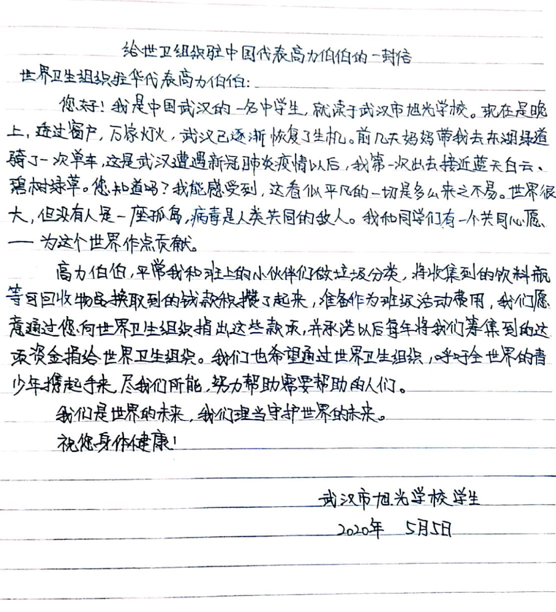 Дядя Гаоли, я обычно занимаюсь сортировкой мусора со своими одноклассниками и обмениваю деньги на предметы, пригодные для повторного использования, такие как бутылки с напитками. Мы готовы собирать деньги для ВОЗ каждый год. Мы также надеемся, что через вас и Всемирную организацию здравоохранения мы будем призывать молодых людей во всем мире взяться за руки и сделать все возможное, чтобы помочь нуждающимся.
