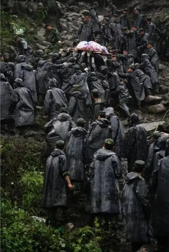 13 мая 2008 года офицеры и солдаты военно-воздушных сил КНР из Чэнду использовали свои тела для перевозки раненых. Фотограф - Лю Инхуа