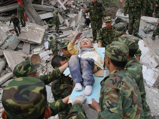 Лан Чжэн, 3-летний мальчик, спасенный из-под обломков в Бэйчуань провинции Сычуань, 13 мая 2008 г. Он сделал салют для солдатов, которые его спасли, чтобы выразить свою благодарность.