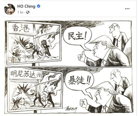 На картинке изображен человек, напоминающий Трампа, который по-разному относится к беспорядкам в Сянгане и Миннесоте.