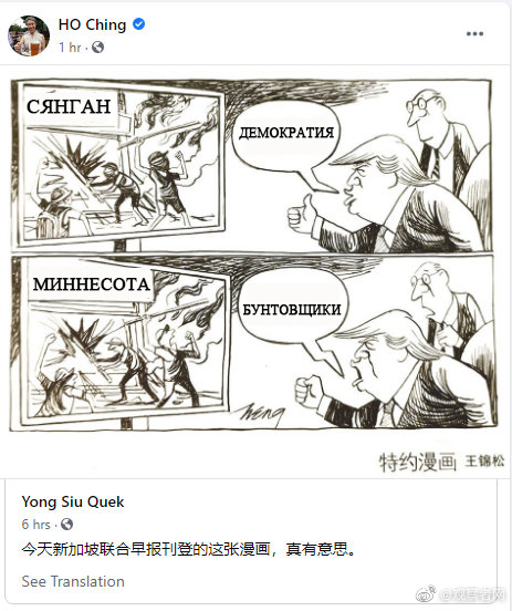 2 июня, ?Жэньминь жибао? онлайн -- Вечером 1 июня генеральный директор сингапурской корпорации Temasek Holdings, супруга премьер-министра Сингапура Ли Сяньлуна Хо Чин в личном аккаунте на одной из платформ социальных медиа сделала репост карикатурного изображения, в котором высмеиваются ?американские двойные стандарты?.