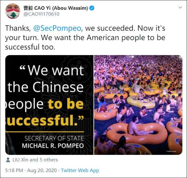 20 августа китайский дипломат в Ливане Цао И опубликовал фотографию, которая вызвала большой резонанс за рубежом. На этой фотографии он выражает ?благодарность? Помпео фразой ?Спасибо, Помпео, мы уже добились успеха. Теперь ваша очередь. Мы искренне надеемся, что американский народ также добьется успеха?.
