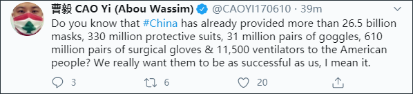 В отличие от ?спасибо? Помпео, Китай доказал на деле, а не только на словах, что он действительно желает американскому народу удачи. Цао И заметил, что Китай предоставил США 26,5 миллиардов масок, 330 миллионов комплектов защитной одежды, 31 миллион пар очков, 610 миллионов пар хирургических перчаток и 11500 аппаратов ИВЛ. ?Знает ли об этом Помпео??, - добавил он. Дипломат надеется, что американский народ последует примеру китайского и также одержит победу над эпидемией. Китайцы ему это искренне желают.