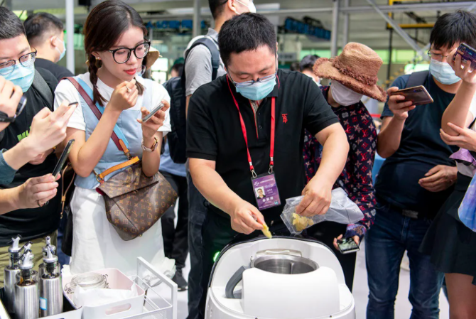 1 сентября представитель экспозиции знакомит журналистов с роботом-поваром, который представлен в выставочной зоне сервисных роботов Китайской международной ярмарки торговли услугами-2020.