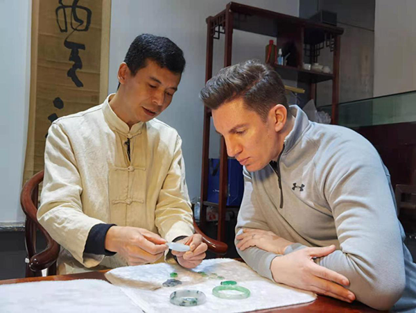 Мастер резьбы по нефриту Ян Шумин рассказывает иностранному другу о методах распознавания жадеита.