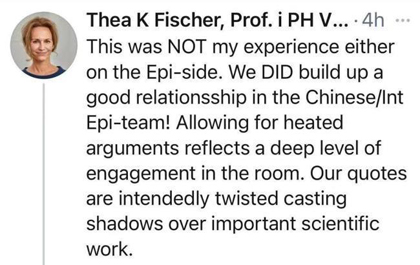 Позицию Дасзака поддержала и другой специалист ВОЗ, побывавший в Ухани, эпидемиолог Теа Фишер. ?У меня в команде эпидемиологов тоже был совершенно НЕ ТАКОЙ опыт. Мы наладили хорошие отношения между китайскими и иностранными эпидемиологами!? — рассказала эксперт в своём Twitter. Как отметила Фишер, ?оживлённые споры?, на которые ссылалась The New York Times, говорят о ?высоком уровне вовлечённости?. ?Наши цитаты были намеренно искажены, чтобы бросить тень на важную научную работу?, — пожаловалась Фишер.