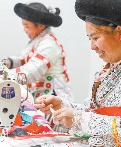 3 февраля, уезд Цяньси города Бицзе провинции Гуйчжоу, жители деревни обрабатывают одежду в цехе для поддержки нуждающихся.