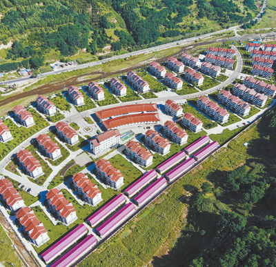 9 августа 2020 года, пункт централизованного размещения переселенных из бедных районов жителей в районе Циньчжоу города Тяньшуй провинции Ганьсу, среди гор стоят небольшие здания с красной черепицей и белыми стенами, окруженные прекрасным пейзажем.