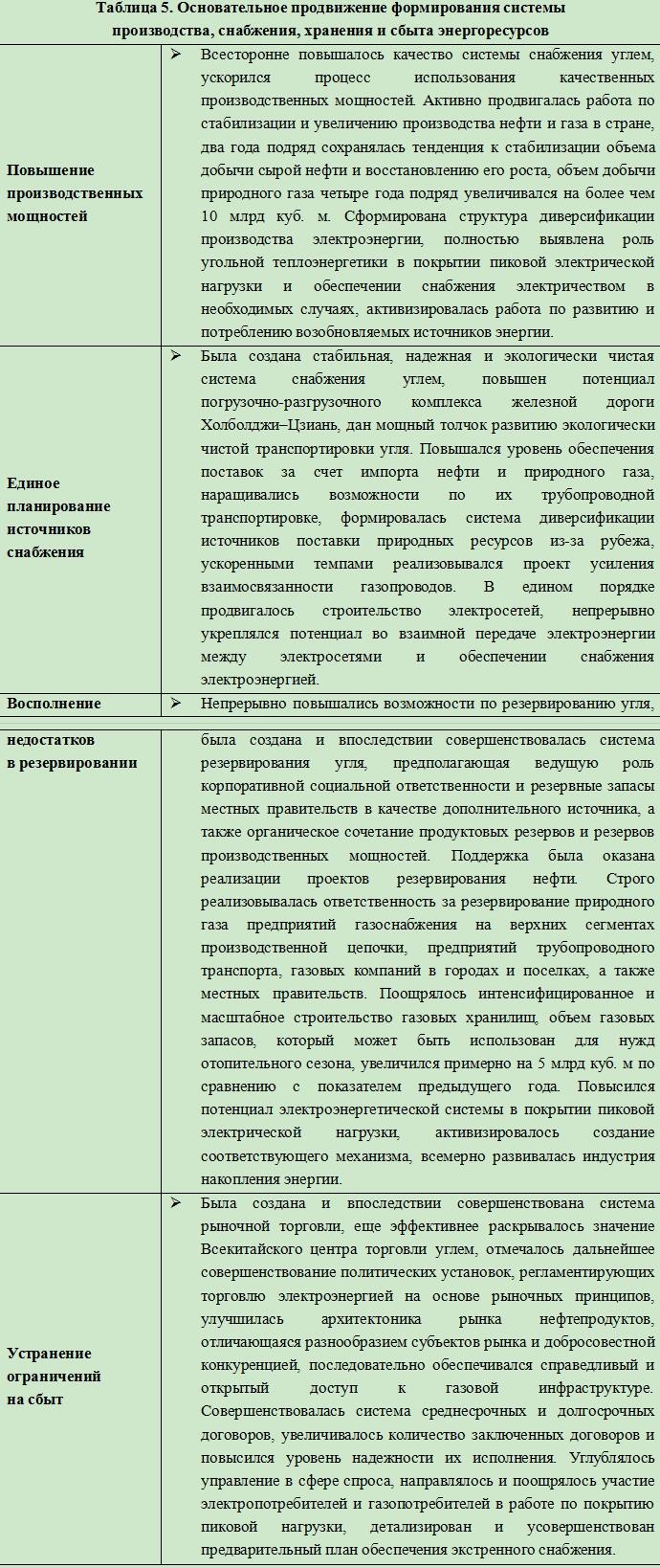 В-четвертых, продолжали повышаться возможности обеспечения энергетической безопасности. Активно продвигалась работа по созданию системы производства, снабжения, хранения и сбыта угля, электроэнергии, нефти и газа, значительно повысился уровень самообеспеченности дефицитными полезными ископаемыми, стимулировалось увеличение запасов и производства нефти и газа в стране, наращивалась возможность их резервирования, усиливалось строительство крупных объектов электроэнергетики. Главные электросети страны были в основном объединены в единое целое, мощность линий электропередачи из западных районов в восточные достигла 260 млн кВт. Китай сохранил за собой первое место в мире по установленной мощности электроагрегатов, использующих ветро-, гелио- и гидроэнергию. Установленная мощность электроагрегатов, использующих неископаемые источники энергии, увеличилась до 980 млн кВт. Непрерывно развертывалась работа по реконструкции электроэнергетической системы с целью повышения ее гибкости, каждый из коэффициентов эффективности использования ветровой и фотовольтаической электроэнергии, а также гидроэнергии превысил 96%.