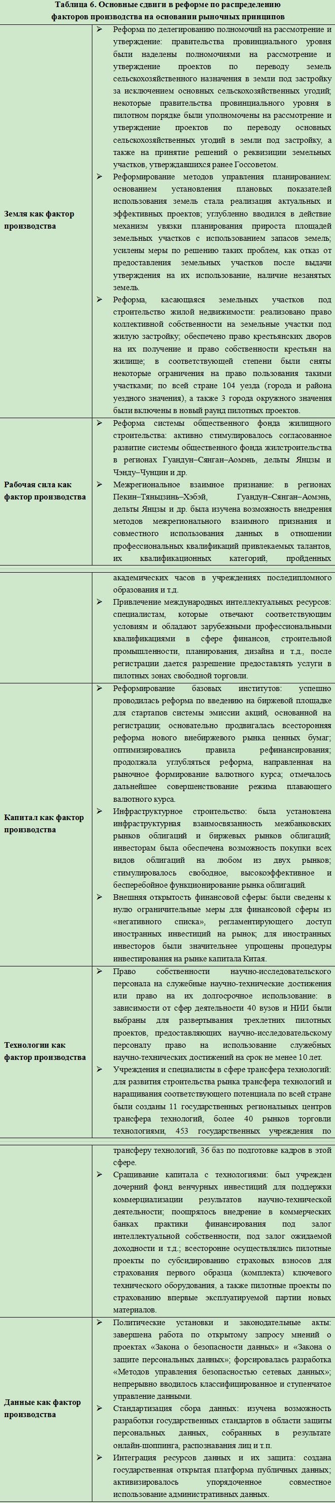 Во-первых, продолжали совершенствоваться система и механизм распределения факторов производства на основании рыночных принципов. Углублялось реформирование методов управления планированием использования земель, правительства провинциального уровня были наделены еще большими полномочиями в этой области. Начался новый раунд пилотной реформы порядка использования сельских земельных участков под строительство жилых домов, также были отрегулированы и усовершенствованы сферы использования доходов от передачи права пользования земельными участками, приоритет в использовании этих доходов был отдан оказанию помощи подъему села. Ускоренными темпами совершенствовалась система оценки квалифицированных технических кадров, постепенно расширялись каналы присвоения квалификационных категорий на негосударственных предприятиях, последовательно вводился в действие механизм взаимного признания профессиональных квалификаций кадров в рамках региональной интеграции. Углубленно проводилась реформа права использования результатов научно-технической деятельности, права распоряжения этими результатами и права на доходы от них. Развертывались пилотные проекты по предоставлению научно-исследовательскому персоналу права собственности или права на долгосрочное использование результатов научно-технических исследований, полученных во время исполнения ими своих служебных обязанностей. Осуществлялись пилотные проекты по освоению и использованию общественных ресурсов цифровых данных, стимулировалось упорядоченное совместное использование административных данных. Был разработан план действий по формированию рыночной системы высокого стандарта.