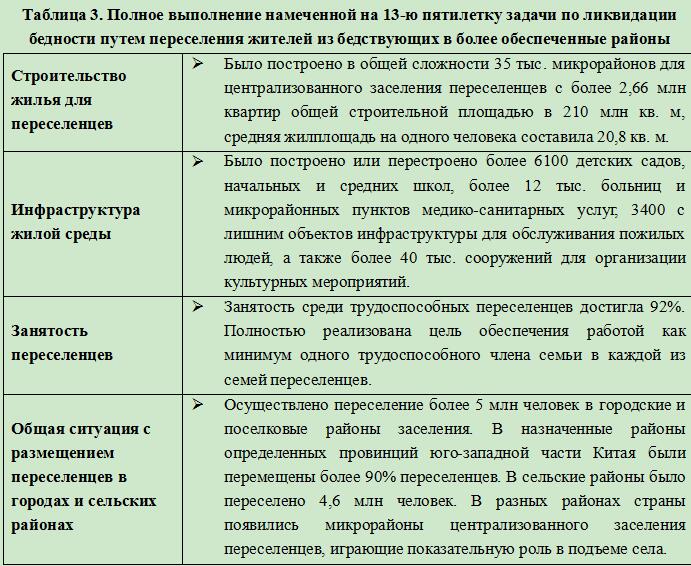 Во-первых, была одержана полная победа в интенсивной борьбе с бедностью. Над ходом работы по ликвидации бедности был осуществлен четкий контроль. Бюджетные средства на национальные проекты были в приоритетном порядке выделены ?трем районам и трем округам?, а также другим чрезвычайно бедным районам. Для того, чтобы минимизировать негативное влияние эпидемии и наводнений на интенсивную ликвидацию бедности, мы оказывали приоритетную поддержку малоимущему трудоспособному населению в поиске работы или заработков, разными способами расширяли масштабы предоставления оплачиваемой работы взамен выдачи пособий, наращивали динамику искоренения нищеты за счет развития производств и увеличения занятости, усиливали организацию стыковки производства и сбыта, а также научно-технологическую поддержку. В то же время были развернуты акции в поддержку малоимущих за счет потребления товаров и услуг, предоставляемых бедными районами, своевременно реализовались такие меры поддержки, как обеспечение минимальных социальных гарантий. Был разработан и принят ряд государственных мер по оказанию последующей помощи переселенцам из слаборазвитых районов в более благополучные. Полностью завершилась намеченная на 13-ю пятилетку задача по избавлению более чем 9,6 млн человек от нищеты путем их переселения из бедствующих в более обеспеченные районы. Особые усилия были приложены для закрепления достижений в сфере ?трех гарантий? (т.е. гарантии для малоимущих категорий сельского населения обязательного образования, основных медицинских услуг и безопасного жилья – Прим. перев.). Комплексное применение таких механизмов обеспечения, как базовое медицинское страхование, страхование на случай серьезных заболеваний, медицинская помощь и т.д., эффективно облегчило финансовую нагрузку для малоимущего населения, связанную с расходами на медицинские услуги. Последние программы по реконструкции аварийных домов в сельской местности в рамках интенсивной ликвидации бедности были завершены в назначенный срок. Была окончательно решена проблема с обеспечением безопасной питьевой водой населения, которое по ныне действующему критерию находится за чертой бедности. Проводилась государственная проверка результатов работы по интенсивной ликвидации бедности. Создан механизм мониторинга и оказания последующей помощи выбравшимся из нищеты людям для того, чтобы предотвратить их возможный возврат к бедности. Благодаря вышеперечисленным мерам все 98,99 млн малообеспеченных сельских жителей, которые находились за чертой бедности согласно действующему критерию, без исключения были избавлены от нищеты, ?ярлык бедности? был окончательно снят с 832 слаборазвитых уездов, из категории бедности были полностью выведены 128 тыс. нуждающихся деревень. Была ликвидирована абсолютная бедность и тотальная бедность в отдельных районах.