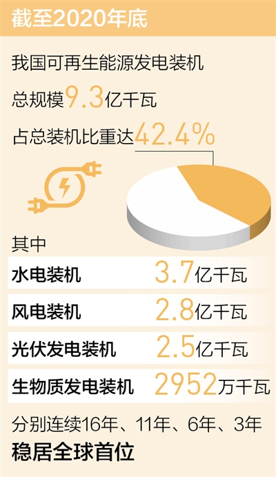 Согласно данным, на конец 2020 года установленная мощность гидроэлектроэнергии составляла 370 миллионов киловатт, мощность ветровой энергии - 280 миллионов киловатт, мощность фотоэлектрической энергии - 250 миллионов киловатт, а мощность выработки биоэнергии - 29,52 миллиона киловатт, которые соотвественно 16 лет, 11 лет, 6 лет и 3 года подряд занимали первые места в мире. В настоящее время Китай уже сформировал относительно полную отраслевую систему технологии возобновляемых источников энергии. В области гидроэнергетики она обладает крупнейшими в мире независимыми проектными и производственными мощностями по созданию турбин мощностью в миллион киловатт. Технология низкоскоростной ветроэнергетики занимает передовые позиции в мире, и более 90% установленной мощности отечественной ветроэнергетики используется в бытовых вентиляторах.