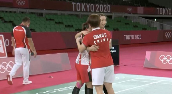 Индонезийские спортсменки Грейсия Полий и Априйани Рахайю, ставшие победительницами в парном разряде по бадминтону, от волнения разрыдались. Китайские спортсменки Цзя Ифань и Чэнь Цзиньчэнь, завоевавшие серебряную медаль, взяли на себя инициативу, чтобы поздравить и обнять своих соперниц.