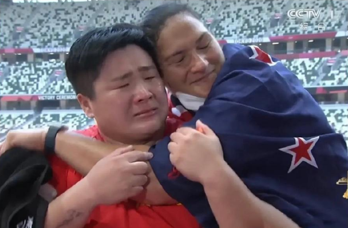 Китаянка Гун Лицзяо выиграла золотую медаль в толкании ядра среди женщин. Новозеландская спортсменка и бронзовый призер Валери Адамс первой обняла Гун Лицзяо и поздравила ее.